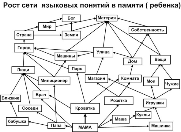 Новая совокупность ассоциативно связанных смыслов образует Мир Природы, Человека, его потребностей и навыков, действий. А связи ассоциативно возникают при обучении ребенка. Но суть модели — это её универсальность и запись в отрыве от конкретики текущего момента и текущей потребности. Более того, как правило, для использования этой памяти и такой модели требуется также время на представление в памяти этой связи как порядка действий — алгоритма.