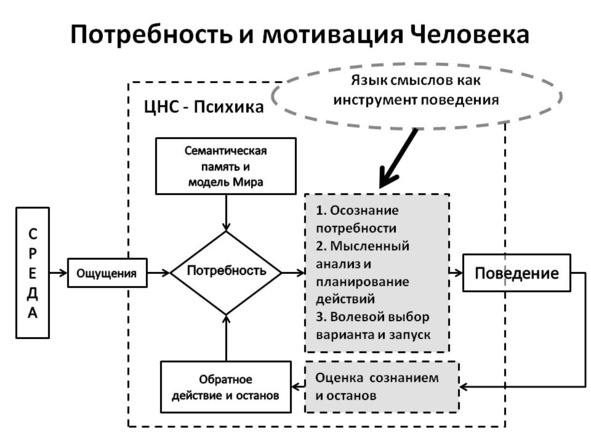 На основе мотивации Человек определяет потребность, цель и средства поведения для её удовлетворения, а затем волевым образом запускает поведение. И процесс мотивации изображен в потребностном цикле Человека.