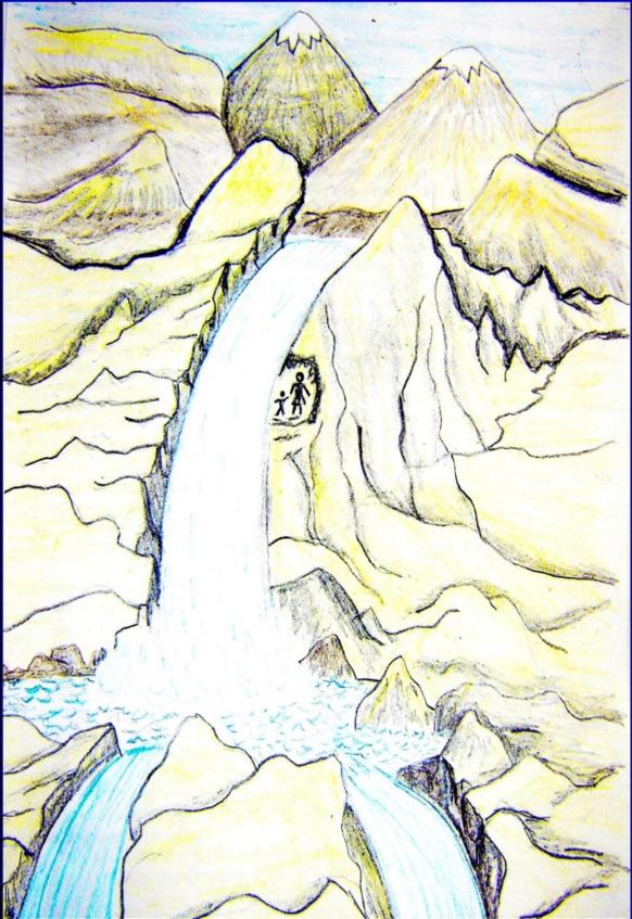 — Вон видишь красивый водопад, — сказала Яга, — это мой самый любимый. За ним скрыта пещера. Хочешь, покажу?