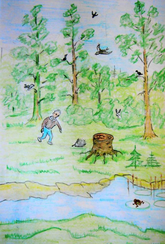 И так, как бы заигрывая со мной, она с громким стрекотом каждый раз перелетала, когда я приближался к ней. Вдруг из кустов выкатился ежик. Я подбежал к нему, а ежик сразу свернулся в клубочек, выставив свои колючки во все стороны. В это время рядом на куст села сойка и так пронзительно закричала, что я даже вздрогнул. Не успел я подойти к ней, как она что-то прокричала и улетела.