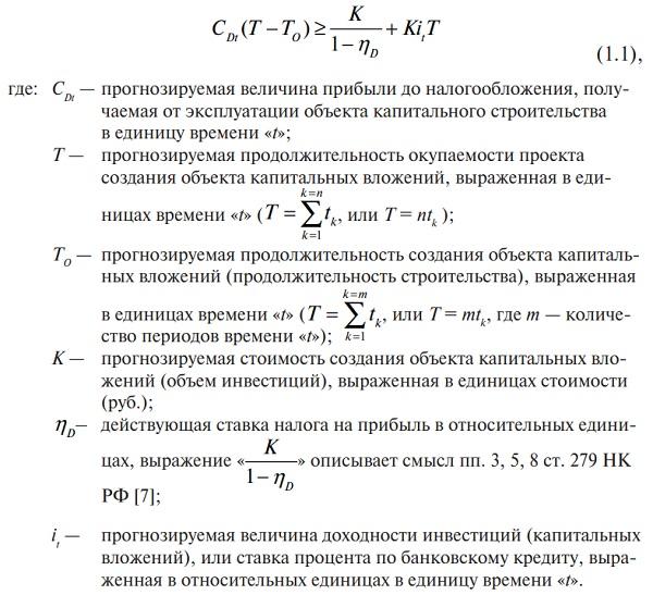 Эффективность капитальных вложений для организаций, являющихся плательщиками налогов по общей системе налогообложения (то есть не имеющих освобождения по уплате налога на прибыль) может оцениваться при помощи математического выражения: