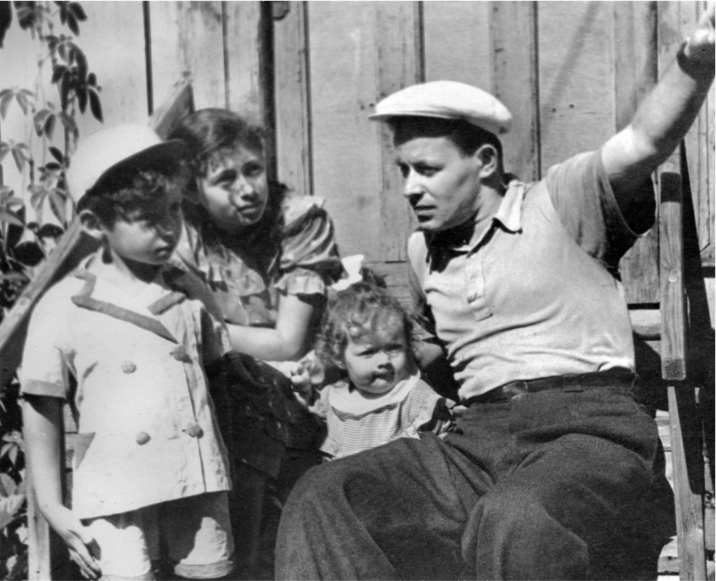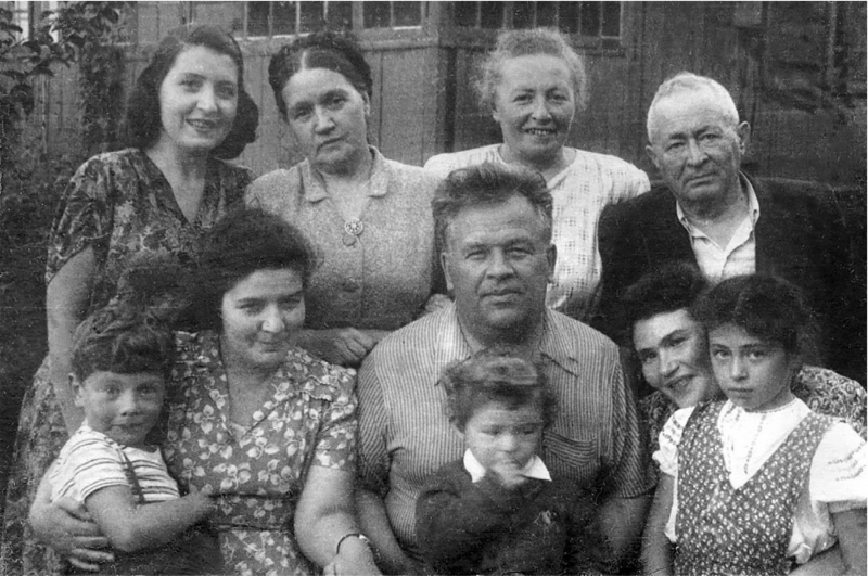 Русско-еврейская семья на даче в Баковке. Стоят: неизвестная, Серафима Озерова, Ита Майзиль, Самуил Паперный; сидят: Калерия с Вадиком, Николай Озеров с Вовой Собкиным, Мира Кривинская с Ирой. 1940-e. Архив семьи Паперных