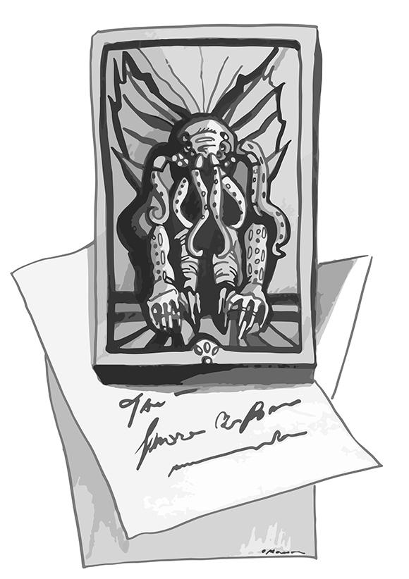 Над цими літерами або ієрогліфами було зображено щось або хтось, однак таке імпресіоністське виконання не дозволяло чітко зрозуміти, що саме там було зображено. Це було щось на зразок портрету або символу чудовиська, складно було тоді сказати напевне, але я точно знав, що таке могла породити лише хвора фантазія. Якщо я скажу, що моя уява побачила у цьому всьому одночасно зображення восьминога, дракона і якоїсь невдалої карикатури на людину, не думаю, що буду далекий від істини. М'ясиста голова зі щупальцями вінчала гротескне, вкрите лускою тіло, а за спиною у цього створіння було щось на зразок крил. Але навіть не окремі деталі, а саме загальні обриси всієї цієї істоти робили її такою моторошною та жахливою. Фігура була зображена на тлі архітектурних споруд, які віддалено нагадували циклопічну кладку з великих тесаних кам'яних брил.