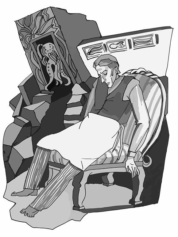 Молодий скульптор ще не переступивши поріг почав просити професора розшифрувати ієрогліфи на барельєфі, використовуючи свої глибокі знання в археології та мовознавстві. Він поводив себе якось неприродно і відчужено, говорив ніби перебуваючи в якомусь трансі або напівсні. Мій дядько спочатку відповів йому досить різко, оскільки глиняна табличка з написами була очевидно виготовлена зовсім нещодавно і не мала ніякого відношення до археології. Однак те, як емоційно і пристрасно Вілкокс почав заперечувати, справило на мого дядька таке глибоке враження, що він записав його слова максимально дослівно. Скульптор розмовляв дуже експресивно, в цьому я потім і сам переконався. Ось що він сказав моєму дядькові: «Так, ви маєте рацію, це дійсно нова скульптура, я створив її минулої ночі прямо уві сні, коли мені снилися якісь дивні міста. А сни, вони навіть старші за задумливого Тюра, всевидячого Сфінкса та потопаючий в садах Вавилон».