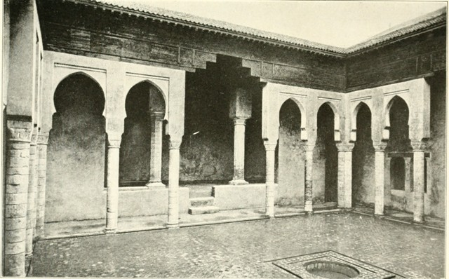 Inside the gate of the Kasbah one comes on more waste land and on other walls—for all Moroccan towns are enclosed in circuit within circuit of battlemented masonry. Then, unexpectedly, a gate in one of the inner walls lets one into a tiled court enclosed in a traceried cloister and overlooking an orange-grove that rises out of a carpet of roses. This peaceful and well-ordered place is the interior of the Medersa (the college) of the Oudayas. Morocco is full of these colleges, or rather lodging-houses of the students frequenting the mosques; for all Mahometan education is given in the mosque itself, only the preparatory work being done in the colleges. The most beautiful of the Medersas date from the earlier years of the long Merinid dynasty (1248-1548), the period at which Moroccan art, freed from too distinctively Spanish and Arab influences, began to develop a delicate grace of its own as far removed from the extravagance of Spanish ornament as from the inheritance of Roman-Byzantine motives that the first Moslem invasion had brought with it from Syria and Mesopotamia.