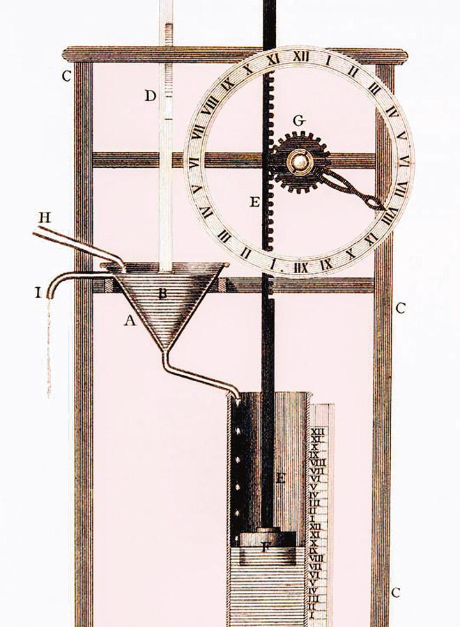 Водяные часы, схема которых приведена на иллюстрации, не обладают всеми функциями часов Ктесибия, но чертеж дает представление о том, как работают подобные устройства. Изображение взято из «Циклопедии, или Универсального словаря искусств, наук и литературы» Абрахама Риса (1820).