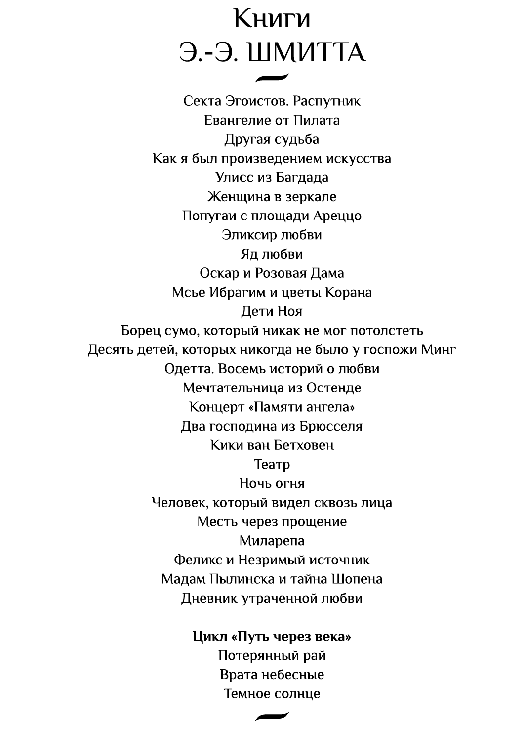 Эрик-Эмманюэль Шмитт — мировая знаменитость, лауреат Гонкуровской премии и многих других наград. Его роман «Оскар и Розовая Дама» читатели назвали книгой, изменившей их жизнь, наряду с Библией, «Маленьким принцем» и «Тремя мушкетерами». Его романы переведены на 45 языков и огромными тиражами выходят в более чем 50 странах. «Путь через века» — грандиозная философско-романтическая сага Шмитта, попытка охватить единым взглядом и осмыслить всю человеческую историю.