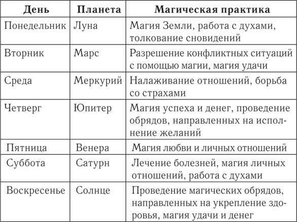 Ниже приведена таблица соответствия дней недели и влияющих на них планет.