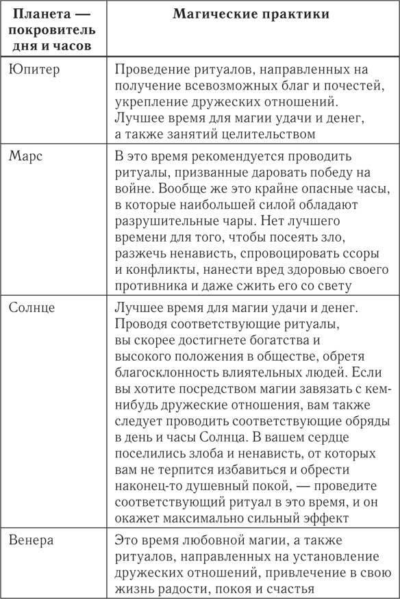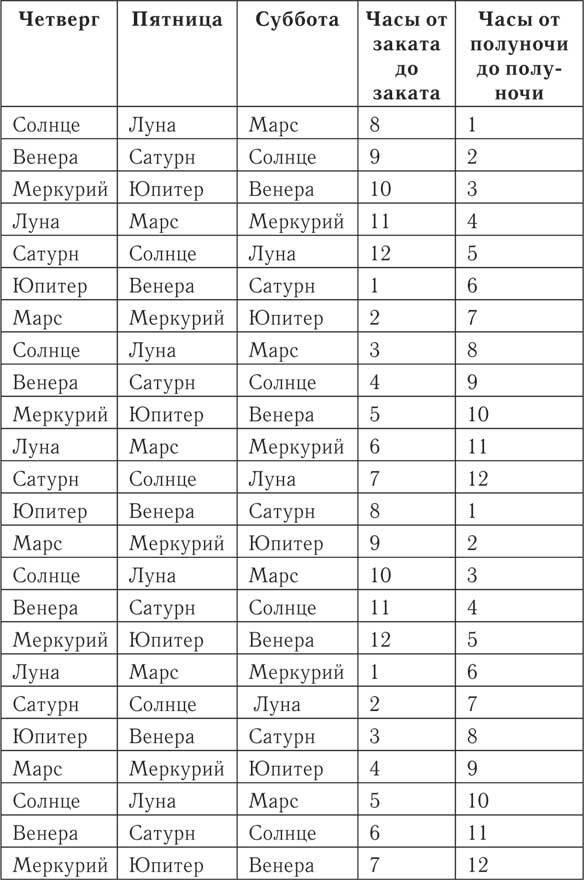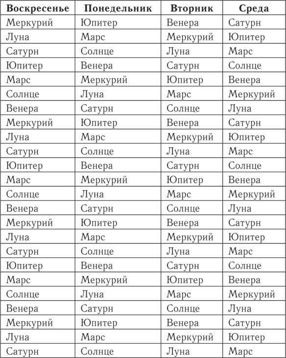 Теперь вам нужно запомнить порядок планет: Солнце, Венера, Меркурий, Луна, Сатурн, Юпитер и Марс. Запомнили? Прекрасно. Начинаем еще один отсчет. В понедельник сразу же после часа Луны идет час Сатурна, затем Юпитера и, наконец, Марса. Все, планеты закончились, а заход еще не скоро. Ничего страшного. Нужно просто начинать отсчет сначала, только на этот раз не с Луны, а с самой первой планеты списка – Солнца. Итак, у нас получается следующая цепочка; Луна – Сатурн – Юпитер – Марс – Солнце – Венера – Меркурий – Луна – Сатурн и т. д. Так мы просчитываем все двадцать четыре часа.