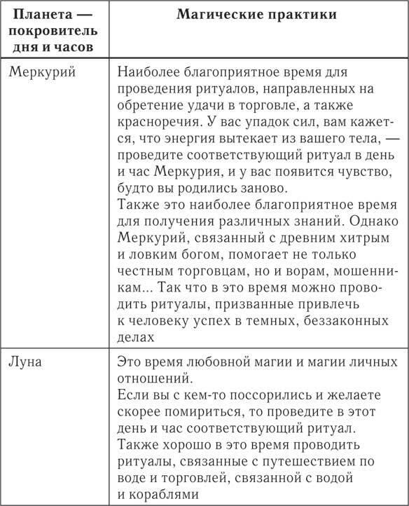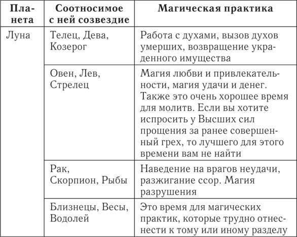 Если же вы не можете по какой бы то ни было причине проследить перемещения Луны, то постарайтесь проводить приведенные в таблице обряды тогда, когда Луна видна на небе (днем!). Особую осторожность следует проявлять тогда, когда Луна на небе не видна (она как бы сливается с Солнцем).