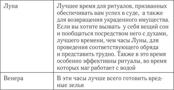 Стоит обратить внимание и на часы. П. Пиобб советует с просьбами обращаться в часы Сатурна, Марса, Меркурия и Луны, любовные ритуалы проводить в часы Сатурна и Марса, значительные магические действия совершать в часы Юпитера и Венеры, а изготовлять пентакли в часы Меркурия.