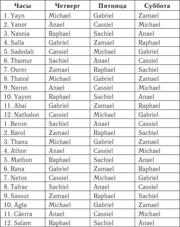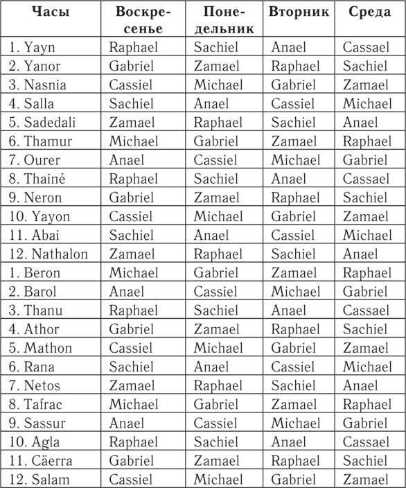 Знайте также, что существуют духи различного порядка, некоторые из них управляют небесами, другие подчинены планетам, третьи пребывают в элементах Огня, Воздуха, Воды и Земли. Есть определенное время для вызывания этих духов, дни и часы, когда они имеют наибольшую силу и особую власть.