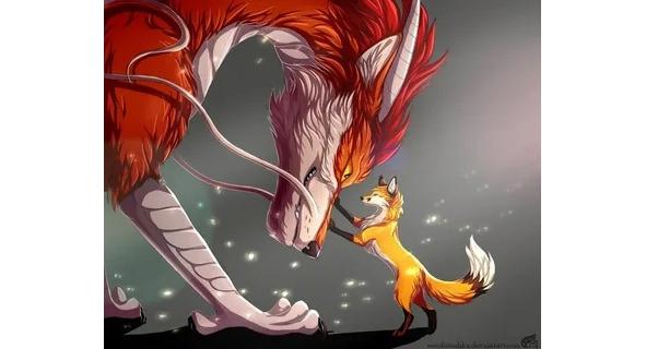 И с этими словами спали с Дракона толстые цепи. Это были злые слова-чары, которыми его приковал Кощей к дереву. Расправил Дракон свои крылья, взмыл высоко в небо, полёту радуется и свободе. Коснулись слова Лисички его сердца, стало оно чистое и доброе. И Дракон больше не жёг никого, а жил со всеми в дружбе и дарил языки пламени для костра и печи.