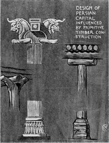 We see, too, the collective hand of tradition and the adherence to accustomed forms in the adoption or imitation of features of timber construction in stone construction and ornament by the ancients; as, for instance, in the form of the Persian capital from Persepolis, and in the dentil ornament of classical architecture mentioned in the preceding chapters.