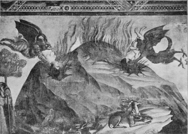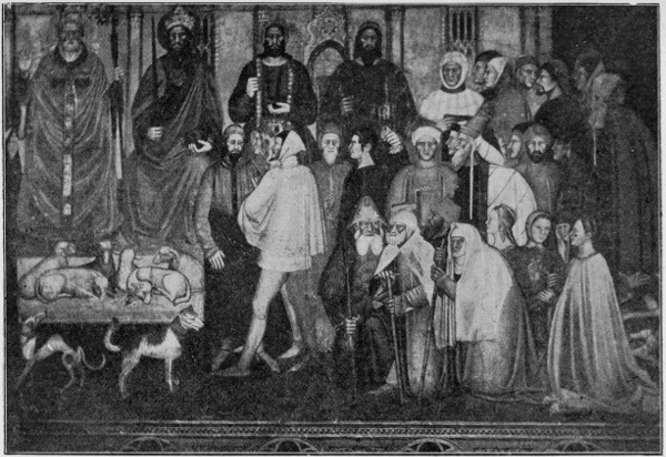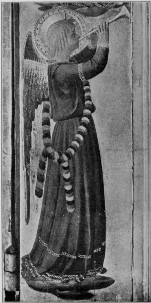 For vivid dramatic intensity of conception and earnestness of purpose the work of Orcagna stands out among the early painters of Florence. Andrea Orcagna was the son of a goldsmith of Florence. The goldsmiths of the fourteenth and fifteenth centuries were in general excellent designers, and not unfrequently became painters, as in the instances of Francia, Ghirlandajo, Verrocchio, Andrea del Sarto. It was in his father's workshop that Andrea Orcagna first learned his art. He was born before 1310, and he painted at the Campo Santo in 1332. His famous work was the fresco still to be seen on the wall of the Campo Santo at Pisa—"The Triumph of Death." It presents us with certain contrasts of life and death, of pleasure and pain, of pomp and pride and poverty, the severe life of the holy man, the gay life of the pleasure seeker. There is a striking group of huntsmen reining in their horses at the sight of certain grim coffins containing great and pompous personages in various stages of decay. Grotesque fiends, too, are seen hustling wicked ones into a fiery pit. Thus does the early painter enforce the old moral. Thus does he paint the sharp contrasts of life and death, the short life and the merry one; the careless worldling and the rich and powerful finally levelled by death; while the higher spiritual life and the virtues of self-denial and sacrifice are suggested by the pious and primitive life of the monks.