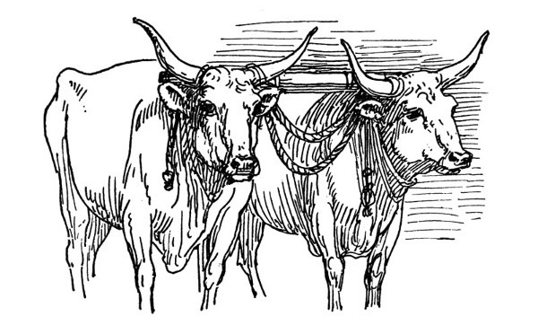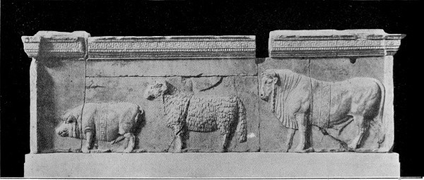 "In the fourth, more such trophies, with the oxen crowned with garlands for the sacrifice.
