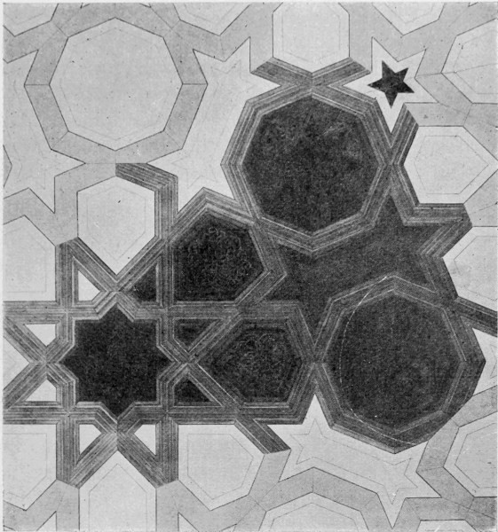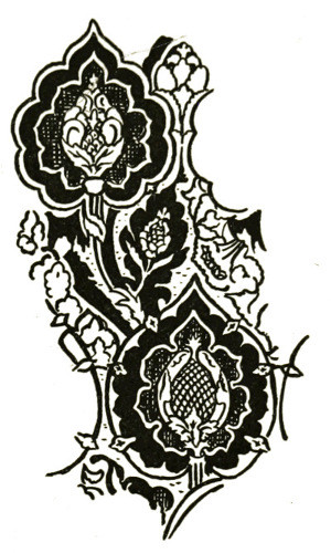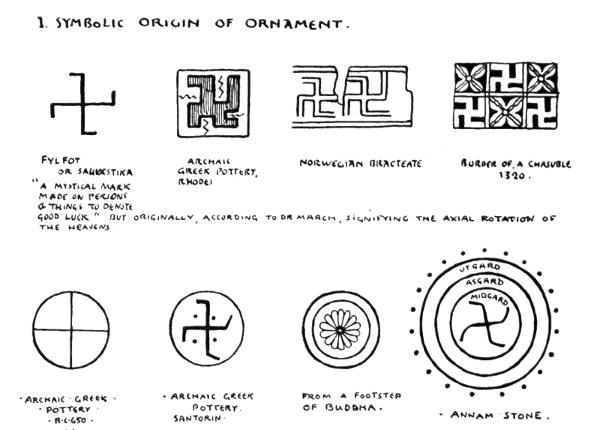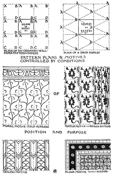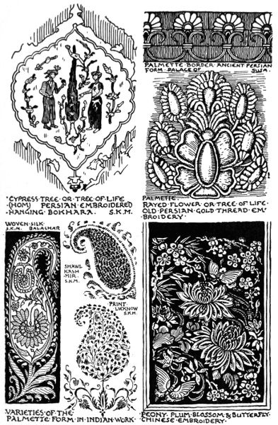 A form in ornament once found, however, is repeated. The eye grows accustomed to it, takes delight in it, and expects its recurrence. It becomes established by use and wont, and is often associated with fundamental ideas of life and the universe itself. Thus we get traditional ornament, handed on from generation to generation, its origin and meaning perhaps lost—like the pictorial significance of the individual letters of our alphabet, which everybody uses, but which require a special kind of study and research to explain their real meaning and original forms.