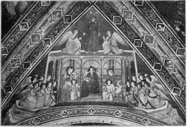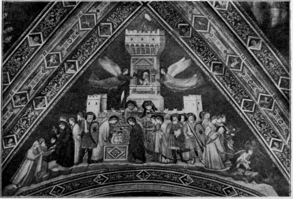 "Here," says Mrs. Jameson, in "Early Italian Painters," "over the tomb of S. Francis, the painter represented the three vows of the order—Poverty, Chastity, and Obedience: and in the fourth compartment, the saint enthroned and glorified amidst the host of Heaven.