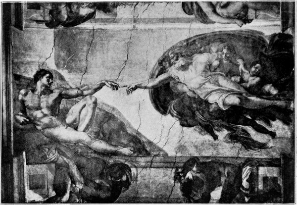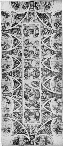 But his great work in Rome, the great work of his life, was the decoration of the ceiling of the Sistine Chapel, the walls of which had been painted by earlier artists of the Florentine school: Signorelli, Cosimo Rosselli, Perugino, Ghirlandajo, Botticelli. The ceiling remained unadorned, and now Michael Angelo was called upon to design his great sacred epic of painting, having to deal with a space 150 feet in length by 50 feet in breadth, upon the concave surface of a round vault, without any architectural or structural enrichment or division save the windows. The theme was the fall and redemption of mankind according to the Bible history.