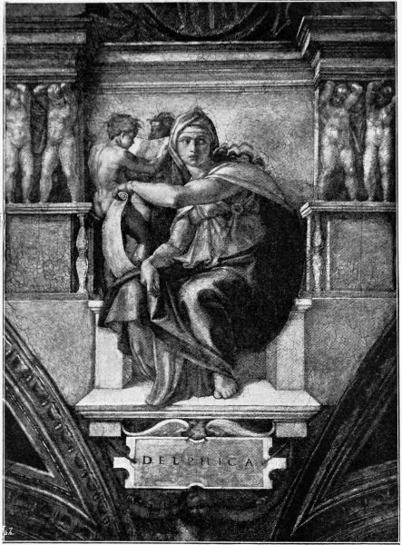 The sculpturesque and architectural feeling which, really stronger in Michael Angelo's work than that of the painter, is very decidedly manifested both in the general plan of the design and in individual figures and details. In order to bring so great a scheme into comprehensive form it was necessary to divide and subdivide the blank ceiling with painted architectural mouldings and ribs into spaces and panels. The titanic youthful figures placed between, upon the ledges and brackets of the framework of the subjects, are very fine and characteristic in style, and essentially sculptors' designs; each would work out as a separate statue, though for all that each single figure, as each figure of every group, bears a certain relation to the rest and fills a harmonious and necessary place in the scheme. The colour is subdued and quiet. It has a gray, cool effect in the chapel, gray blues, pale greens and whites being much used in the draperies, and the chief decorative effect being gained by the opposition of brown flesh tones to the broad, light marble-like framework, or the landscape and sky backgrounds of the subject panels. This great work was completed by Michael Angelo in his thirty-ninth year.
