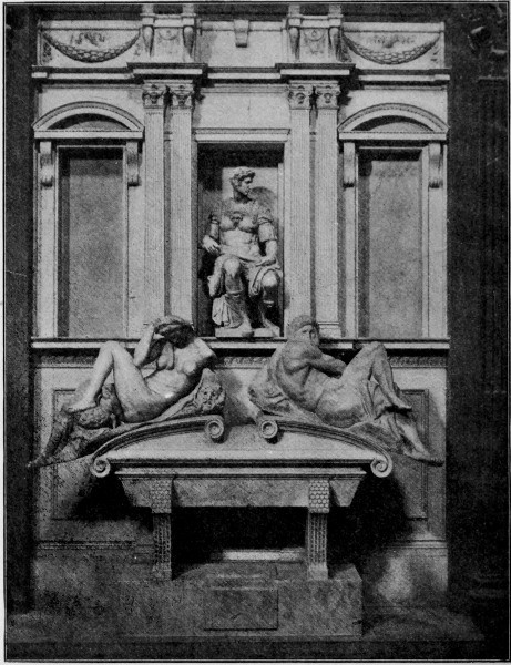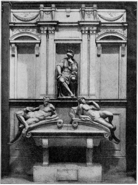 Another great monumental work in which his architectural and sculptural genius come out are the tombs of the Medici in the Church of San Lorenzo. The seated figures of Lorenzo and Giuliano de Medici are placed in the recesses of a Renascence arcade, in front of which are marble sarcophagi, and upon the lids recline figures of Night and Morning, and of Dawn and Twilight respectively. They are very bold and powerful in design, and extremely characteristic in style and treatment, having a certain titanic energy and tragic unrest, as well as pensive mystery, about them, which belong to the strong personality of their designer.