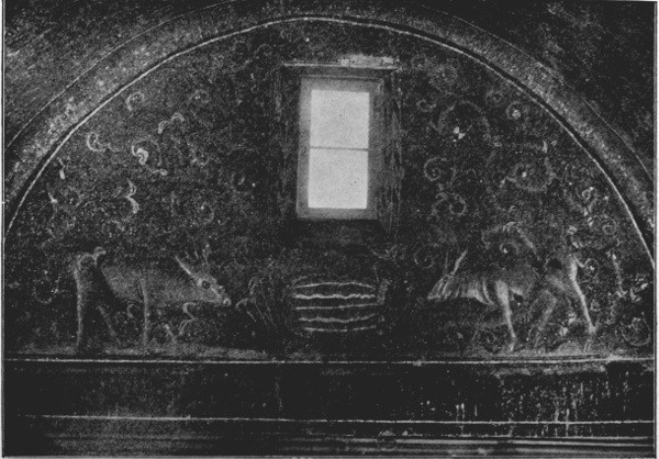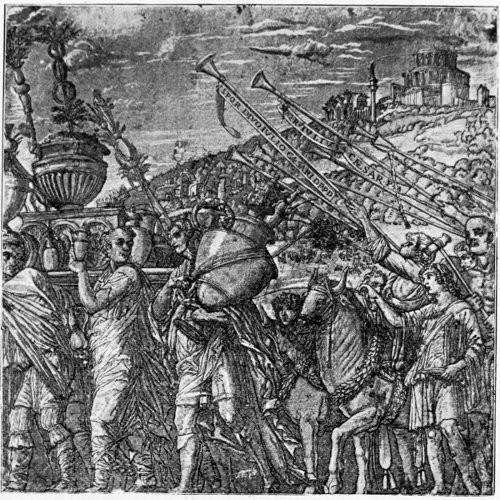 The famous frieze of "The Triumph of Julius Cæsar"—which is now in Hampton Court Palace, having been bought by King Charles I. from the Duke of Mantua—was first designed by Mantegna for the hall of the palace of San Sebastiano at Mantua, and commenced in 1488, before he went to Rome, he finishing it after his return in 1492. There are nine panels or compartments in this frieze: "They are painted in distemper on twilled linen, which has been stretched on frames, and originally placed against the wall with arabesque pilasters dividing the compartments."