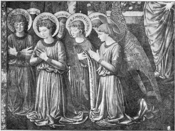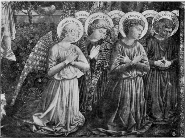 He gives us those charming groups of kneeling angels also in the same chapel. Or he tells the story of the building of the tower of Babel, or of Noah, at Pisa, or of St. Augustine, at San Gimignano, with the same serenity and delight in subsidiary incident and ornament.