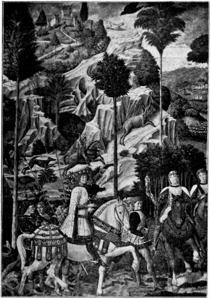 In the frescoes of the Riccardi Chapel at Florence, Benozzo pictures, with loving faithfulness, the Medici princes riding out to the hunt in splendid equipment, in a high upland and wooded country such as one may find around Florence. The subject was "The Adoration of the Magi," represented upon the side walls, "The Nativity" being painted over the altar. The procession of the kings with gifts is seen winding over the hills of the rich and varied landscape, interspersed with groups like the princes, in which Lorenzo the Magnificent appears, and portraits of the painter, his friends, and contemporaries.