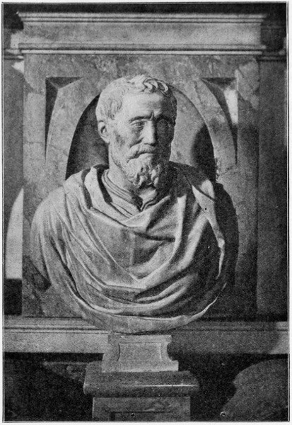 Michael Angelo Buonarotti was born at Settignano, near Florence, in the year 1474. His ambition, personal pride, and masterfulness of temper possibly may be traced to his progenitors—a once noble family. It was, too, against the prejudice of his father that he finally decided his career, becoming the apprentice of Ghirlandajo, It was in the days when Lorenzo the Magnificent ruled over Florence, and the young Michael Angelo became a student in the Academy, founded upon the strength of a collection of antique marbles, busts, statues, fragments in the palace and gardens of that prince. This alone would be sufficient to give a strong classical bias to his style.