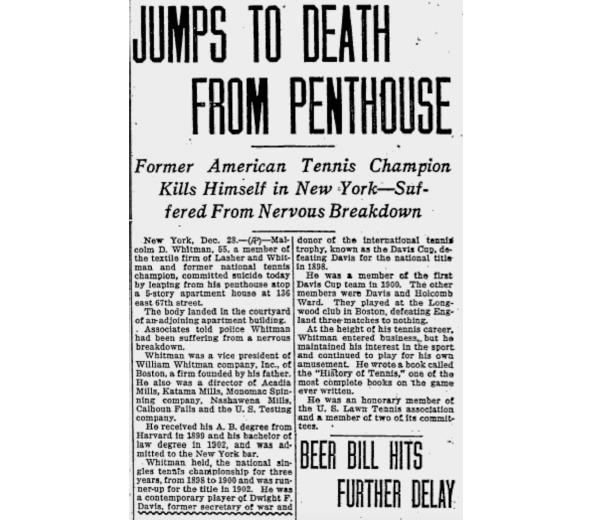 29 декабря 1932 года «Нью-Йорк Таймс» опубликовал небольшую заметку: «Малкольм Д. Уитмен, 55 лет, бывший чемпион Америки по теннису среди любителей и один из первых участников Кубка Дэвиса, вчера разбился насмерть спрыгнув с парапета, окружавшего его пентхаус в пятиэтажном жилом доме №136 по Восточной 67-й улице…». Так нелепо и трагически оборвалась жизнь человека, писателя, бизнесмена и спортсмена, оставившего заметный след в истории американского и мирового тенниса. А ведь поначалу его судьба складывалась вполне благополучно.