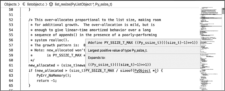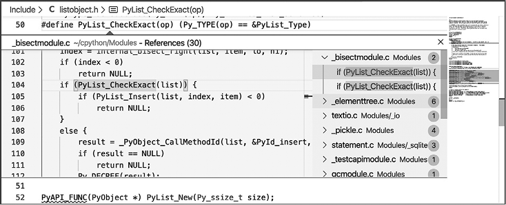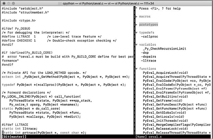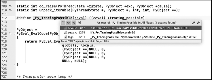 В ходе редактирования и анализа исходного кода CPython обычно возникает необходимость в быстром переключении между методами, функциями и макросами. Простой поиск по тексту не отличит вызов или определение функции от ее реализации. Однако вы можете воспользоваться приложением ctags11 и проиндексировать исходные файлы на разных языках в базу данных с обычным текстом. Чтобы проиндексировать заголовки CPython для всех файлов C и Python в стандартной библиотеке, выполните следующий код: