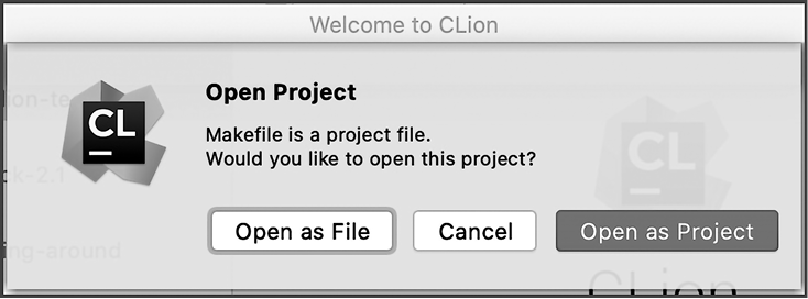 CLion спросит, хотите ли вы открыть каталог или импортировать makefile как новый проект. Выберите вариант Open as Project, чтобы импортировать файл как проект: