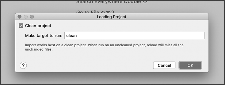 Перед импортированием CLion спросит, какую make-цель следует запустить. Оставьте вариант по умолчанию clean и продолжите выполнение: