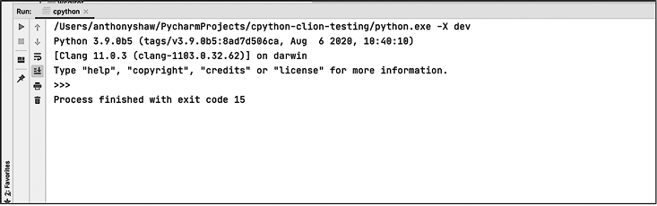 Чтобы протестировать ее, щелкните по кнопке со стрелкой или выберите команду RunRun ’cpython’ в верхнем меню. Снизу в окне CLion должна появиться панель REPL: