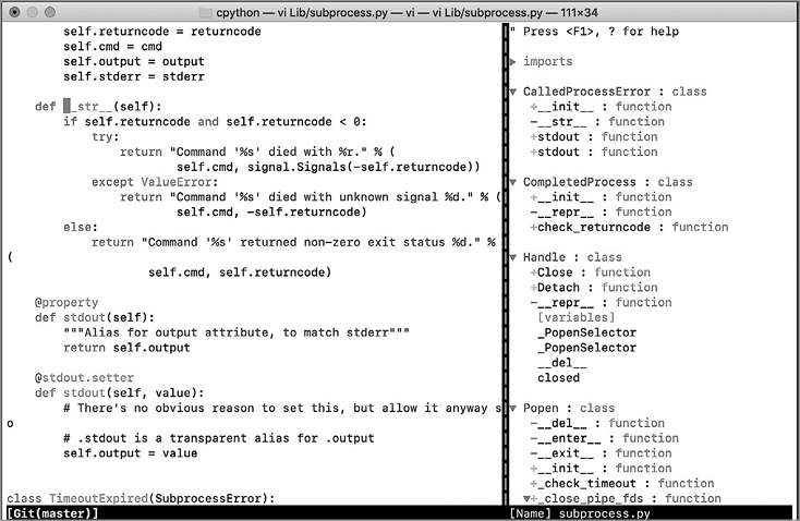 На панели tagbar будет выведена информация об импортированных именах, классах, методах и функциях: