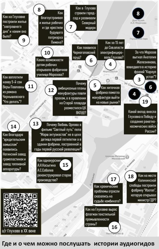 Аудиогиды «Старое Глухово», «Глухово в XX веке» и «Старый Богородск» были выпущены в 2017 году, к 170-летней годовщине начала строительства Глуховских фабрик. Издание путеводителя «Глухово 2022» также приурочено к юбилейным и круглым датам, на которые оказался исключительно щедр 2022 год. Судите сами.