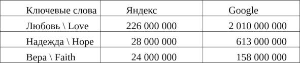 К тому же впервые над тем, что значит любить, мы задумываемся в юности, и вполне очевидно, что в поисках ответа на этот вопрос наши современники вряд ли сразу обратятся к Евангелию, трудам святых Отцов или христианских философов. Скорее всего, они наберут вопрос «что значит любить?» в поисковой строке своего браузера и через долю секунды всемирная сеть даст ответ — причем не один, а 226 млн. ответов — именно столько ссылок мы получили, набрав в русскоязычном Яндексе слово «любовь». Для сравнения на слова «вера» и «надежда» Яндекс предложил соответственно 24 и 28 млн. ссылок. Набрав в англоязычном Google эти же запросы на английском языке, мы получили 158 млн. ссылок на слово «faith» (вера), 613 млн. ссылок на слово «hope» (надежда) и 2 млрд. 10 млн. ссылок на слово «love» (любовь). Так интернет, сам того не ожидая, подтвердил слова Апостола Павла из Послания к Коринфянам: «А теперь пребывают сии три: вера, надежда, любовь; но любовь из них большее» (1 Кор. 13, 13).