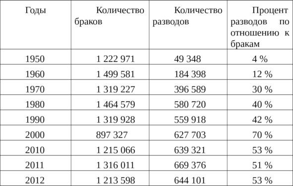 Согласно этим данным, в 1960 г. распадался примерно каждый восьмой брак, в 1970 — каждый третий, сегодня — каждый второй. А ведь все эти люди говорили друг другу: «Я люблю тебя» и не раз. Всего же за послевоенные годы число распавшихся браков выросло более чем в 10 раз.