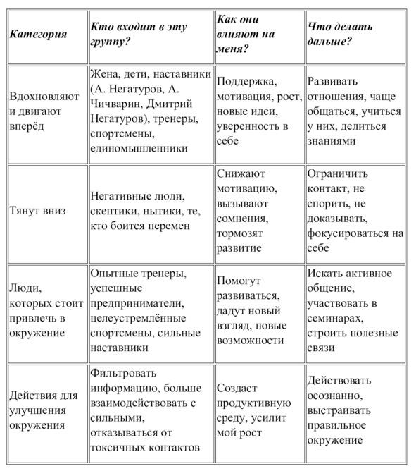 Задача на сегодня — честно заполнить таблицу и сделать первые шаги, чтобы выстроить окружение, которое поможет тебе расти.