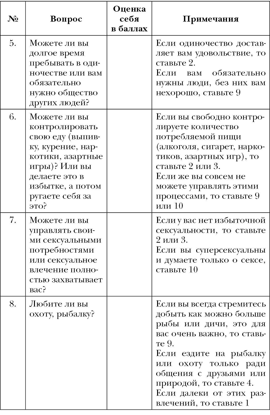 Теперь просуммируйте свои ответы из среднего столбца «Оценка себя в баллах». К полученной сумме прибавьте 10 баллов (это систематическая ошибка). Полученная сумма баллов и будет примерным показателем вашей инстинктивности в процентах.