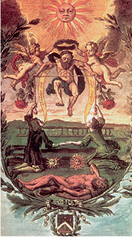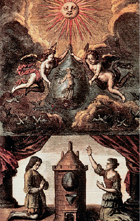 На второй гравюре мы видим следующее: алхимик стоит на коленях перед атанором [7] вместе с soror mystyca, «мистической сестрой», необходимой — согласно некоторым источникам — для алхимического превращения. Находясь по разные стороны печи, они молятся. Над ними два ангела держат стеклянный сосуд, в котором заключены Нептун, Солнце и Луна. Сцена освещена присутствием Бога-Солнца, который раздвигает облака. Вероятно, на этой гравюре изображено начало алхимического процесса, которое передано молитвой, идущей снизу вверх.