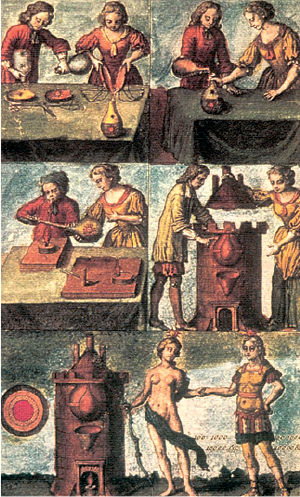 На четырнадцатой гравюре вверху расположено несколько печей, содержимое которых было взвешено и обработано алхимиками; также
