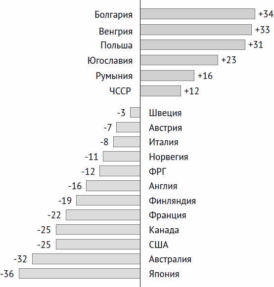 Рис. 1. Изменение показателей смертности от сердечно-сосудистых заболеваний у мужчин в возрасте 40–60 лет в некоторых странах с 1972 по 1982 годы (по данным ВОЗ). Цифры со знаком «минус» означают снижение смертности (в %), со знаком «плюс» – увеличение