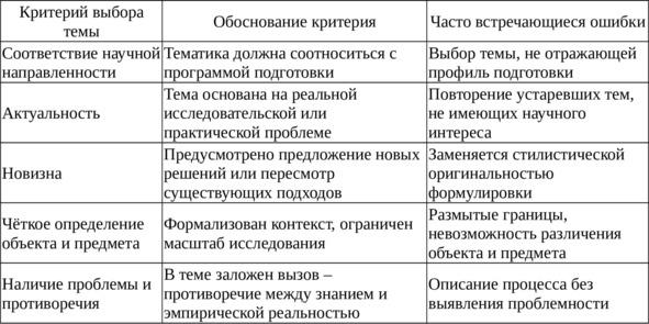 Таблица 1 — Критерии выбора темы магистерской диссертации и типичные ошибки