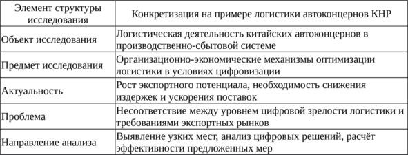 Для ориентации магистранта целесообразно использовать типовую схему логической развёртки темы. Такая схема фиксирует взаимосвязь между исследовательскими элементами и позволяет оценить степень их сбалансированности. В таблице 2 приведён пример такой схемы на основе темы «Оптимизация логистики китайских автоконцернов».
