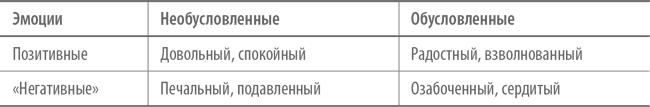 Ваша жизнь тогда хороша, когда вы ощущаете, что счастливы. Вы испытываете самые различные чувства каждый день, не говоря уже про всю жизнь. Психологи всегда делят чувства в соответствии с матричными моделями: в одной категории — «позитивные и негативные», а во второй — обусловленные и необусловленные [7]. Категории позитивные и «негативные» говорят сами за себя, хотя я ставлю понятие «негативные» в кавычки, потому что, как я скоро расскажу, негативные эмоции могут иметь и положительный эффект. Вы можете думать об обусловленных и необусловленных чувствах как о «разбуженных» или «спящих». Таким образом, радость — позитивное и обусловленное чувство, озабоченность — негативное и обусловленное, удовольствие — позитивное и необусловленное, печаль — негативное и необусловленное.