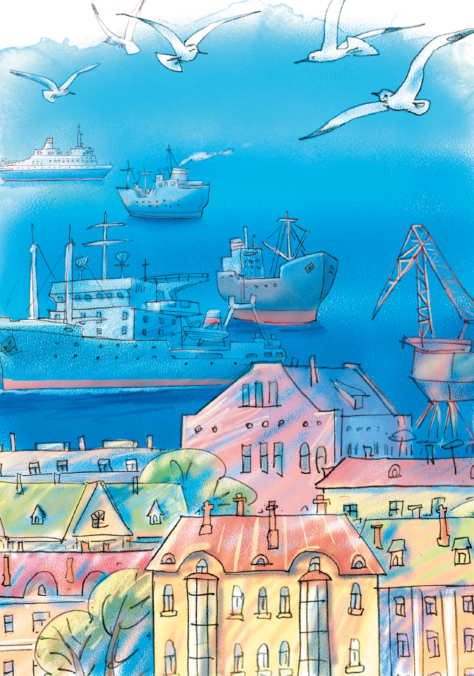 Поезд проскочил сквозь дымный, как печка, тоннель, промчался под громадной скалой и остановился перед похожим на сказочный терем вокзалом. Слева по перрону бежали, толкаясь, пассажиры, покрикивали носильщики. А справа, среди залива, тянулись к небу десятки мачт, упирались в причал чернобокие корабли. А над заливом кувыркались чайки.