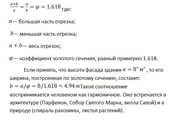 Одной из важнейших гармонических закономерностей является золотое сечение — пропорция, при которой отношение целого к большей части равно отношению большей части к меньшей. Формула золотого сечения, смотрите Рис. 1