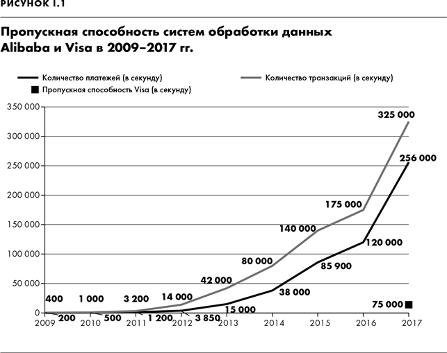 Через три минуты объем продаж составлял уже 10 млрд юаней ($1,5 млрд). Потребовался всего час, чтобы достичь совокупного объема продаж за День холостяка в 2014 г., а впереди было целых 23 часа. На пике активности платформы Alibaba обрабатывали 325 000 заказов и 256 000 платежей каждую секунду. Это было все равно, как если бы все жители Сент-Луиса или Питтсбурга оформляли по заказу каждую секунду. Сравним эти цифры с показателями Visa, второй по величине платежной системы мира. Ее заявленная пропускная способность в августе 2017 г. составляла 65 000 платежей в секунду — одну четвертую часть от уровня Alibaba (рис. I.1)[2].
