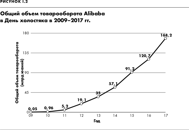 К концу дня Alibaba обработала 1,5 млрд транзакций с суммарным объемом 168,2 млрд юаней ($25 млрд) (рис. I.2). Это почти в два раза больше дневного объема продаж во всем розничном секторе Китая (включая традиционную торговлю и продажу таких дорогостоящих товаров, как автомобили и недвижимость) в 2016 г. Объема продаж свыше 100 млн юаней ($15 млн) добились 167 брендов. Покупатели приобретали на сайте Tmall самые разные товары: одежду, товары для дома, электронику, драгоценности, а в одном случае даже быстроходный катер Aston Martin стоимостью $2,5 млн.
